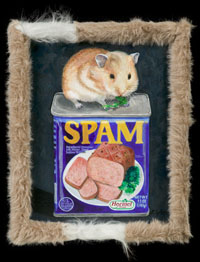 Viagra FallsAcrylic on illustration board, fake fur frame Most images in the ‘RODENT’ series are available as matted prints (except “Hamsterdam”). Since the paintings are different dimensions, the prints are to scale, so they are not necessarily standard sizes. Small 5″ x 7″ (approx.) are $15 Large 11″ x 17″ (approx.) for $25 Please add $2.50 shipping, and Washington State residents add 8.8% sales tax. These paintings came about in response to the constant questions about my art-car, Leopard Bernstein. “Are you a Leo”, “You must really identify with leopards.” None of the above. Of any animal, my personality is most akin to a hamster, and thus the ‘SPAMSTER’ piece was born, and the positive response spawned this group. In my ‘Rodent’ series, there are no subliminal messages regarding ‘mass-media, marketing, consumerism’ et. al., I simply love verbiage and the physical representation of the word play, scale and juxtaposition of such disparate subject matter. These are simply playful pieces based on puns and alliteration. Enjoy.